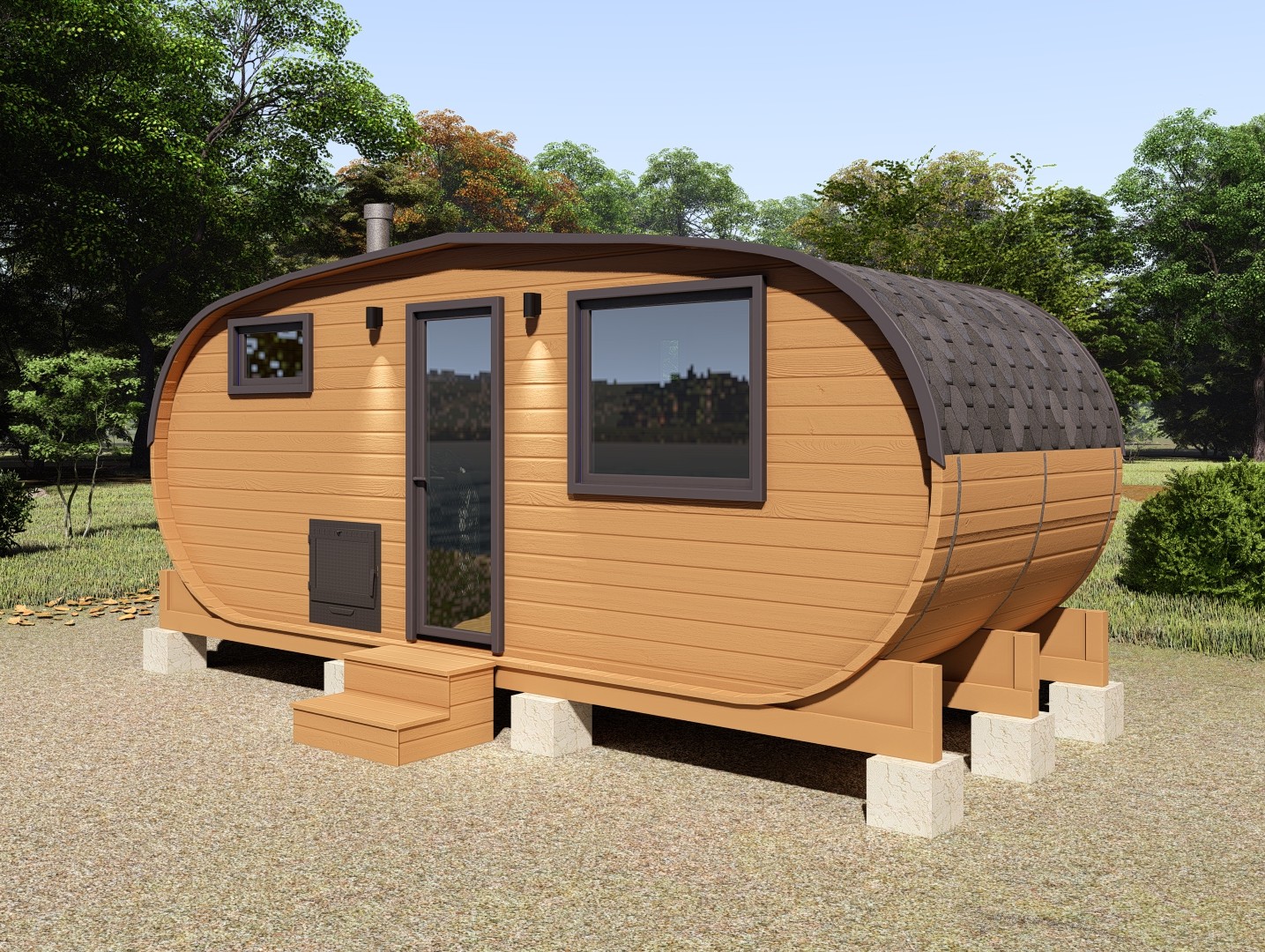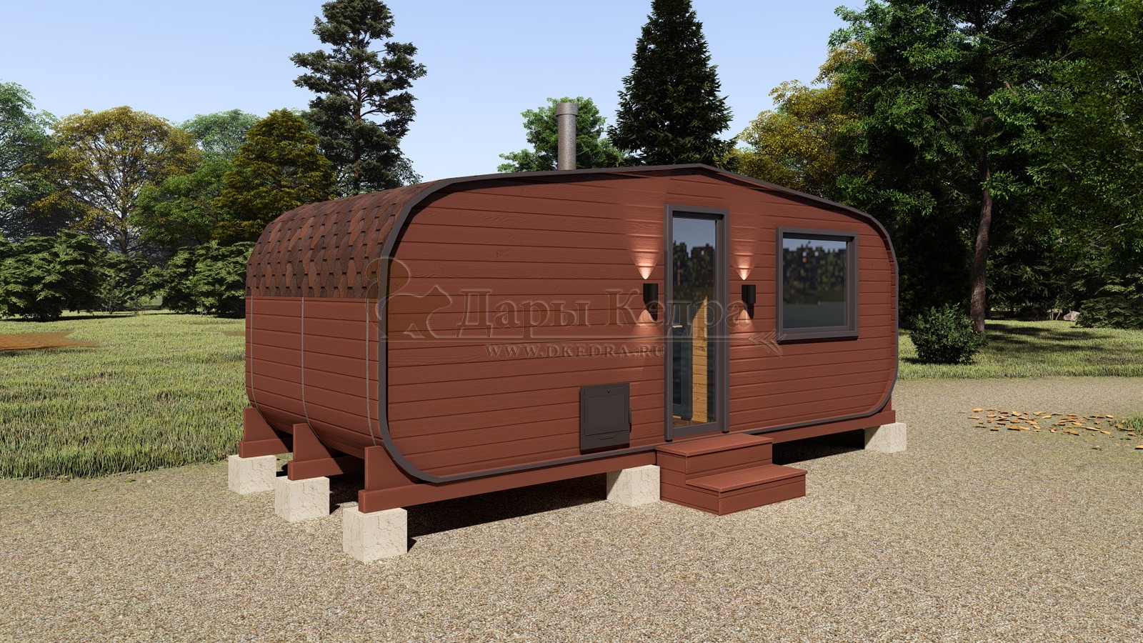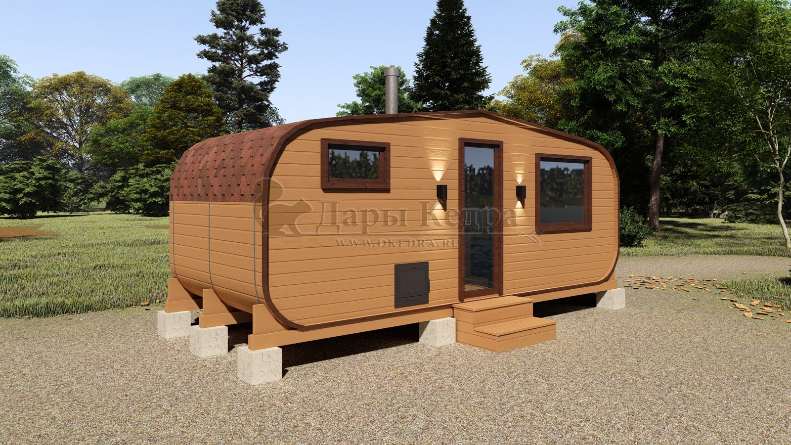Каждая баня-бочка поставляется в полной комплектации "под ключ", включая печь, дымоход, электрику, бак для воды и мягкую кровлю. Благодаря мобильности конструкции, установка не требует капитального фундамента — достаточно ровной площадки или бетонных блоков.