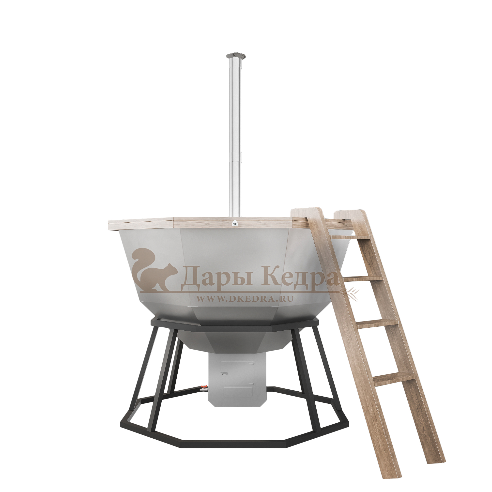 Банный чан из нержавеющей стали Ø-2000 на подставке Банный чан на подставке изготовлен из пищевой стали. Представляет собой большую ёмкость в виде чаши, при нагревании которой можно париться на свежем воздухе. Чан установлен на устойчивую металлическую подставку и оборудован кедровым бортом, скамейками, подспинниками, трапом для ног и приставной лестницей. Нагревание банного чана происходит от обычного костра. Если оборудовать данную модель печью, то банные процедуры можно принимать даже зимой.