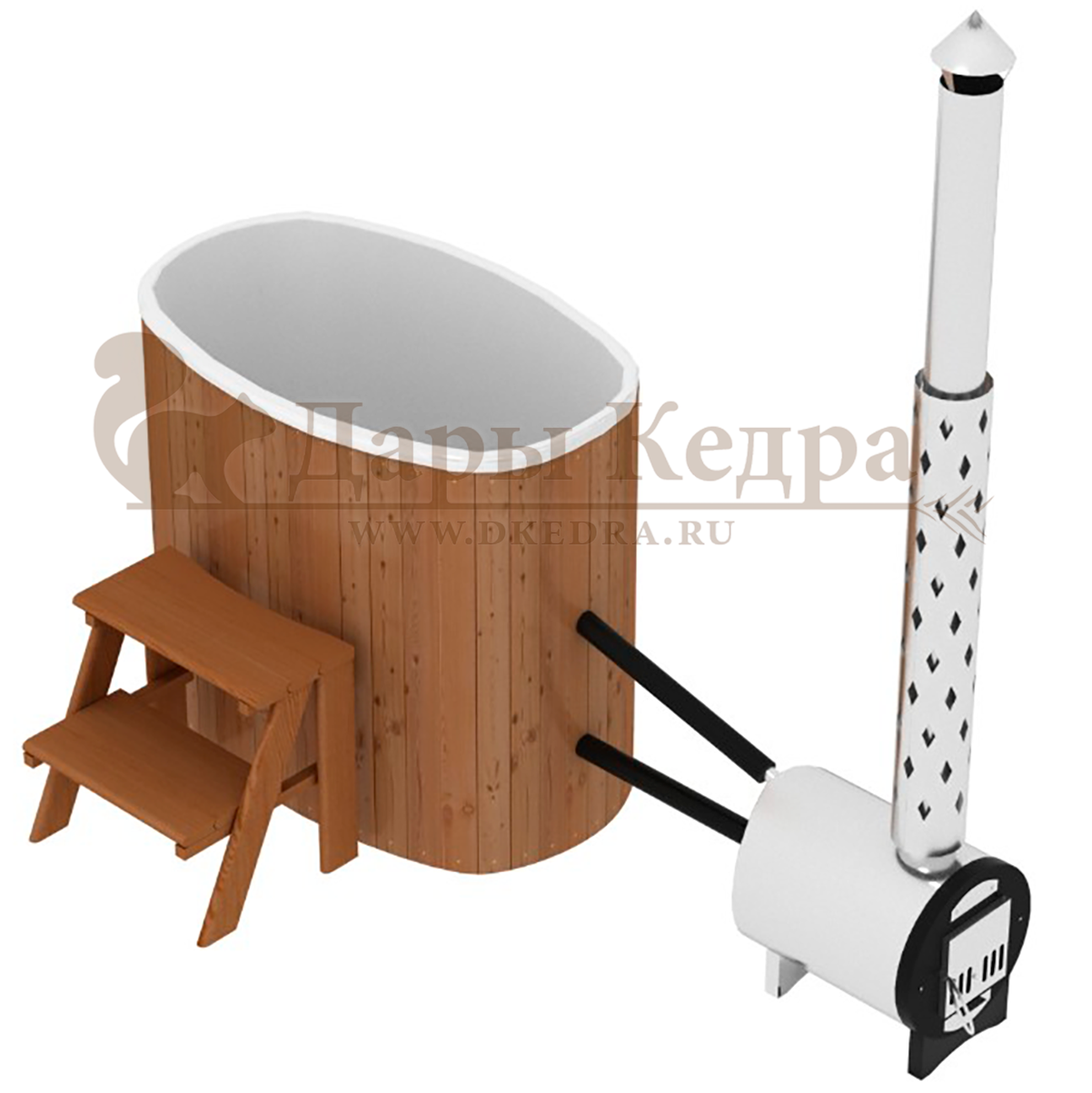 Это уличная подогреваемая купель с овальной внутренней чашей, которая изготовлена из современного прочного и термоустойчивого материала (композита). Форма чаши обеспечивает комфортную посадку во время принятия процедур. Для удобства пользования купель оборудована приставной лестницей. Подогрев воды осуществляется внешней печью с дымоходом. Композитная вставка придает купели красивый внешний вид, продлевает срок службы и облегчает уход за изделием.