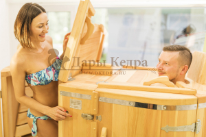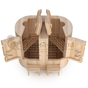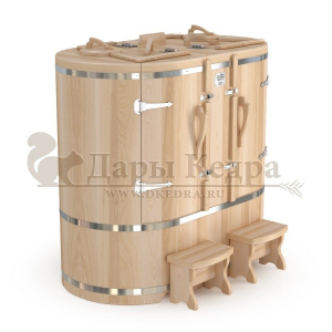 Двухместная фитобочка из кедра - это парная, в которой удобно принимать процедуры двум людям. Она оборудована откидными створками, дверцей, отверстием для головы и перегородкой (по желанию). Толщина стенок составляет 25 мм. Во время парения человек находится внутри кедровой бочки, а голова снаружи. Благодаря этому исключается возможность перегрева. Подлокотники из кедра и внутренние ручки делают эксплуатацию фитобочки более удобной.