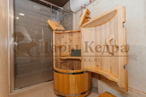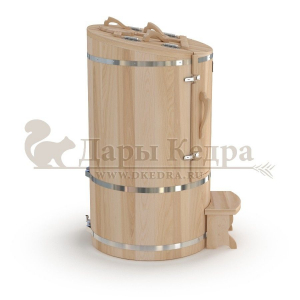 Круглая со скосом. Круглая фитобочка из кедра - это мини парная, которую можно использовать не только в спа-салонах, но и дома. Такая модель наиболее компактна и мобильна. Толщина стенок составляет 25 мм. Фитобочка оборудована откидными створками, дверцей и отверстием для головы. Верхний скос делает положение головы более комфортным и улучшает обзор. Во время парения человек сидит внутри кедровой бочки, а голова находится снаружи. Благодаря этому исключается возможность перегрева. Подлокотники из кедра, встроенные ручки на створках и двери делают эксплуатацию более удобной.